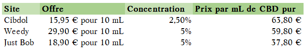 - Juste Bob complète ce trio. Les clients lui attribuent 4,2/5 sur 3355 avis TrustPilot. Le site propose 10 ml d’huile à 5 % pour 18,9€, mais impose un minimum de commande de 40€, ce qui oblige à compléter son panier avec d’autres articles.