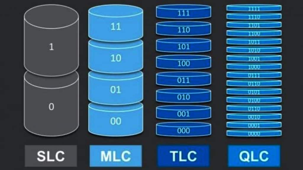 QLC (Quad-Level Cell) : densité maximale, endurance moindre, performances moindres en écriture soutenue.